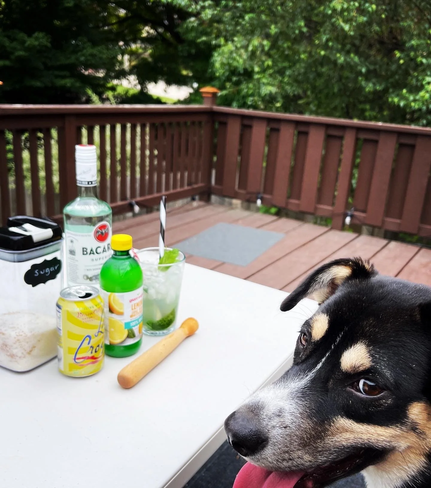 Chase Moe down to get the muddler, wash the muddler, then muddle Bacardi, sugar, and mint leaves in a glass. Mix in the lemon juice, add crushed ice, give some ice to Moe, then top with sparkling water. Stir and add garnish. Give Moe a treat (see above). Enjoy!